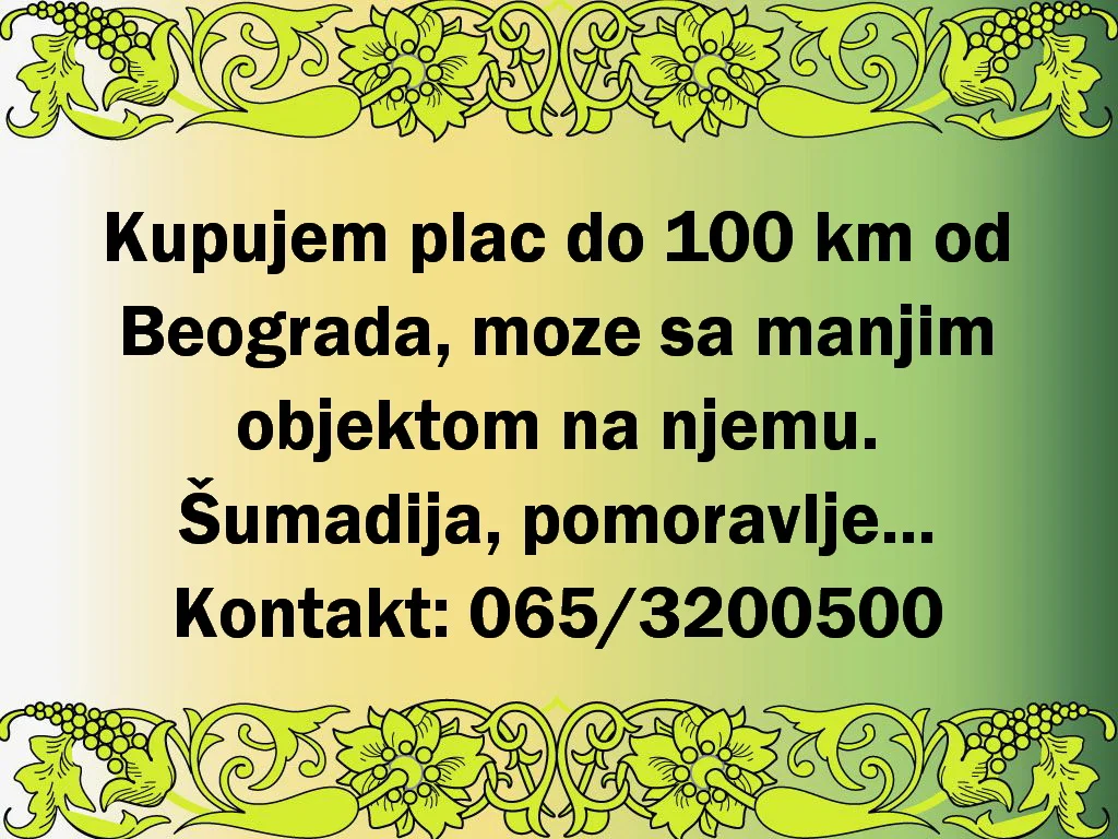 Kupujem plac do 100km od Beograda, moze sa manjim objektom na njemu.